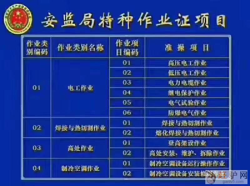 特种作业操作证:作业种类:电工(俗称操作证、上岗证),分类:g+a+n+l+v+5+c+o+m 高压运行维护作业、高压安装修造作业、低压电工作业、安装、维修、发电、配电。自2010年后,老版特种作业操作证(IC卡)样本改用二代身份证似的IC卡类新版中华人民共和国特种作业操作证样本 ,复审为三年一审,特种作业操作证6年换一次证。 g_a_n_l_v_5_c_o_m